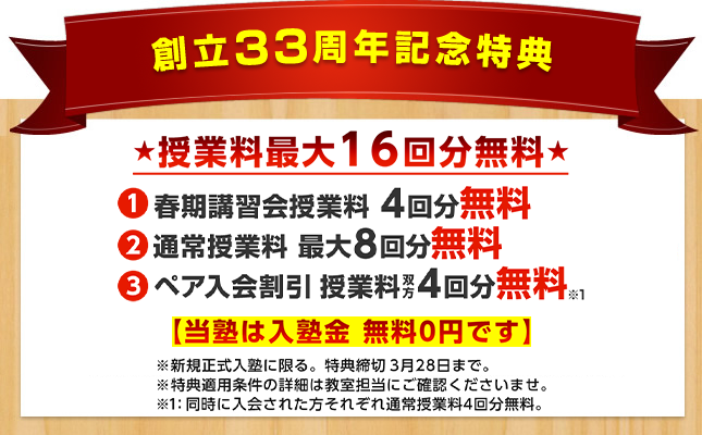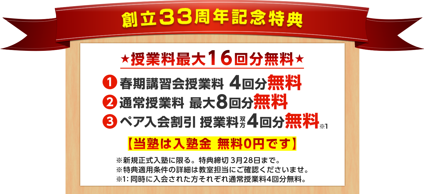 - 中学1年生の3学期~中学3年生の1学期までの入塾者が対象です。