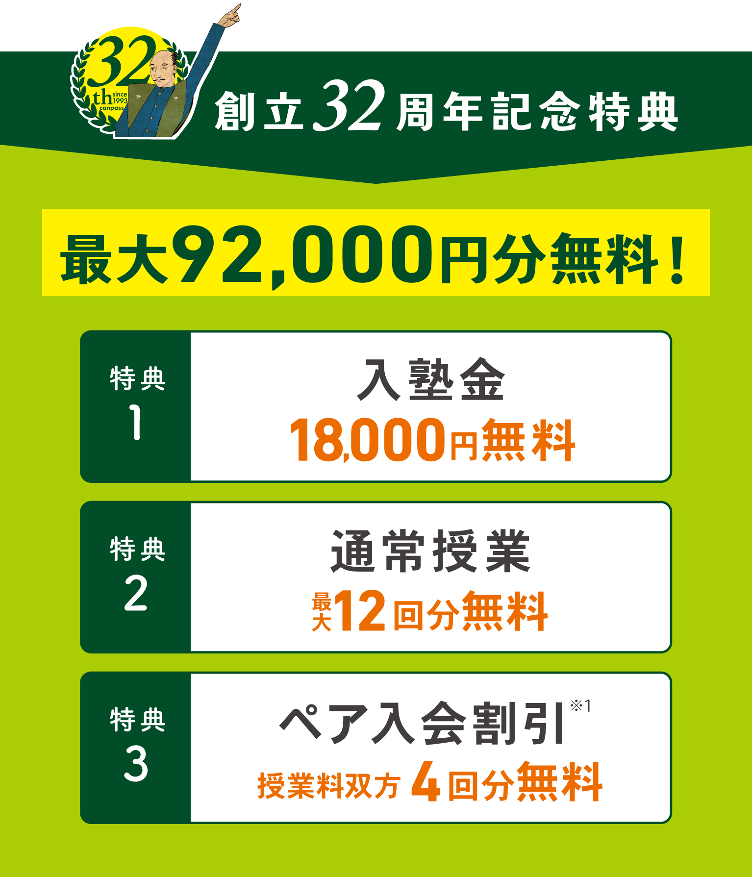 ※1:同時に入会された方それぞれ通常授業料4回分無料。