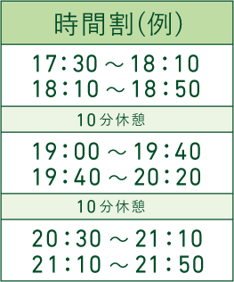通塾日は開校曜日の中からご通塾される方の都合に合わせて決めることができますので、クラブ活動等と両立しやすくなっております。ご都合の良い時間帯を選んでいただき、通塾される時間を何の教科にあてるかも教室担当とご相談の上、お子様にあった時間割を組ませていただいております。